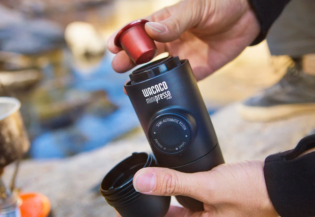 This version of the MiniPresso is the GR – for ground coffee. (the Minipresso takes capsules) It takes standard grinds, and we always take our handheld grinder with everywhere too. Also no electricity needed to grind beans as fine as you need for an espresso! It’s a very unique style of coffee to have on the go that you don’t need a lot of water to make like other brew methods. Most of the time we pack very light, just the essentials and it’s a relief that it literally takes up 20 cm of our backpack space (with the grinder).