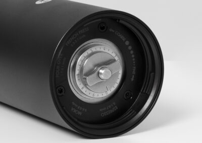 Unique design features are the retractable hopper which cleverly prevent popcorning and with a simply twist, retracts to reduce the grinders overall height for compact storage and no loose bits to get lost. The plastic catch cup can take 40g of grounds and fits neatly onto a 58mm portafilter basket for a no stills transfer.