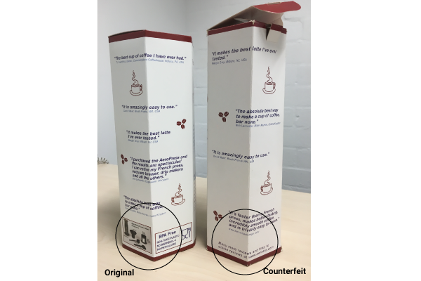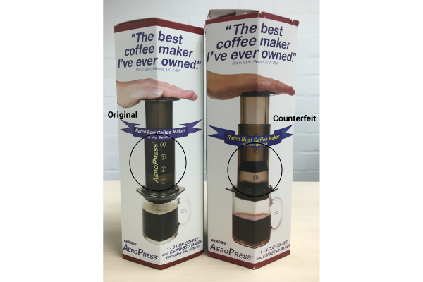 “Air press” a counterfeit was displayed without a box, previously with and named AeroPress, since their delisting on an online store. The latest attempt to sell their units on another online retailer is still the counterfeit.