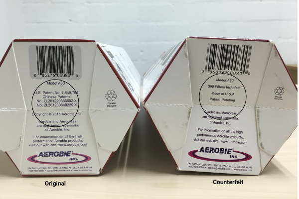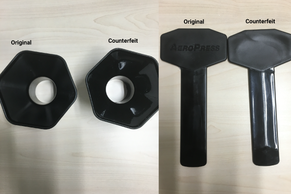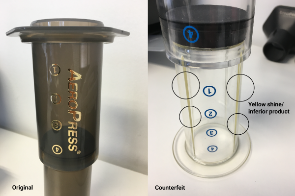 Our parts (stirrer and cone) are branding with the Aeropress trademarks. The counterfeit is not and appear very shiny.